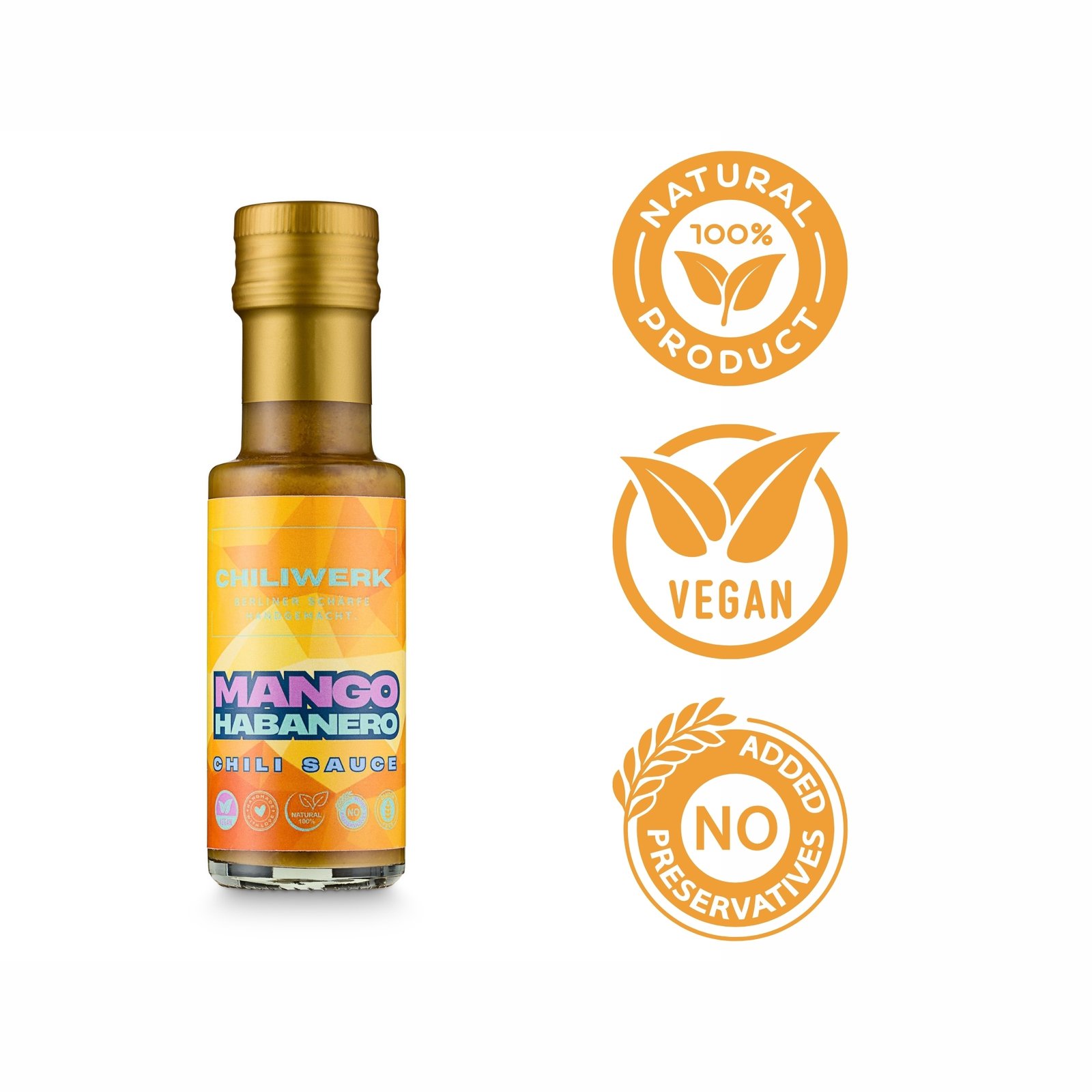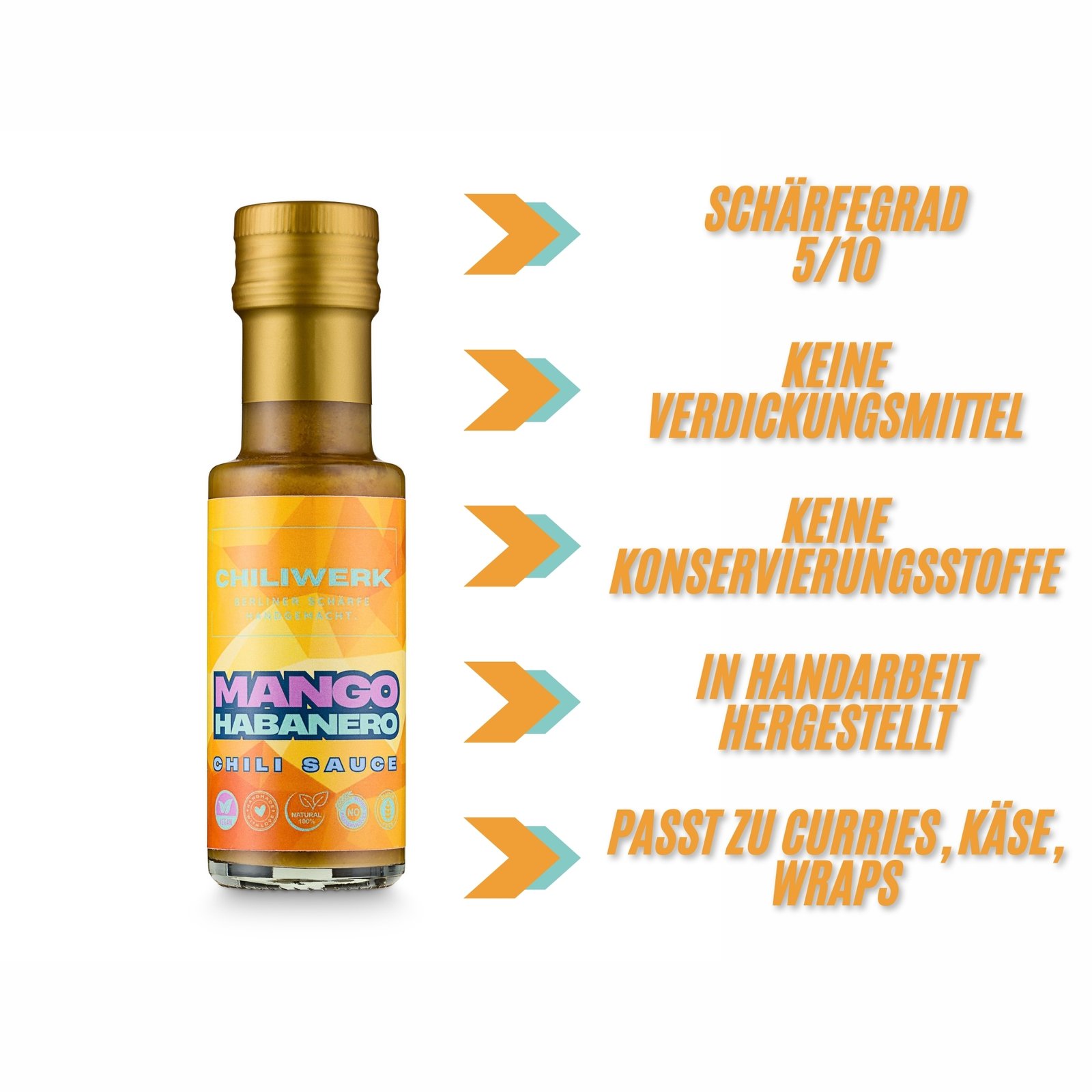 Gelbe Habaneros liefern reichlich Capsaicin, das den Stoffwechsel ankurbelt, Schmerzen lindert und die Durchblutung fördert, während Mango mit ihren Vitaminen A und C die Haut und das Immunsystem stärkt. Schalotten und Knoblauch unterstützen durch ihre antibakteriellen und entzündungshemmenden Eigenschaften die Herzgesundheit und eine ausgewogene Verdauung. Apfelessig fördert den Stoffwechsel, unterstützt die Verdauung und hilft, den Blutzuckerspiegel zu stabilisieren, während Muskovado-Zucker eine natürliche Süße mit wertvollen Mineralstoffen liefert. Ergänzt wird das Ganze durch getrocknete Orangenschale, die reich an Vitamin C und Antioxidantien ist und die Zellgesundheit sowie die Verdauung fördert. Damit ist unsere Chili-Sauce ideal einsetzbar als Marinade, Topping, Verfeinerung oder Dip.